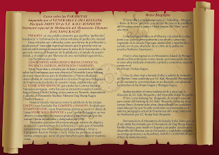 Más información acerca del curso:Paramita es una palabra sánscrita que significa “perfección”, “excelencia” o “culminación" de ciertas virtudes de perfección mental. Estas virtudes son cultivadas como una forma de purificación y ayuda para el buscador espiritual sincero que le permite vivir su vida sin sufrimiento, avanzando hacia la meta de la iluminación, o lo que es lo mismo, al despertar de la sabiduría y el estado de ecuanimidad y el esfuerzo por liberarse de una mentalidad egocéntrica.